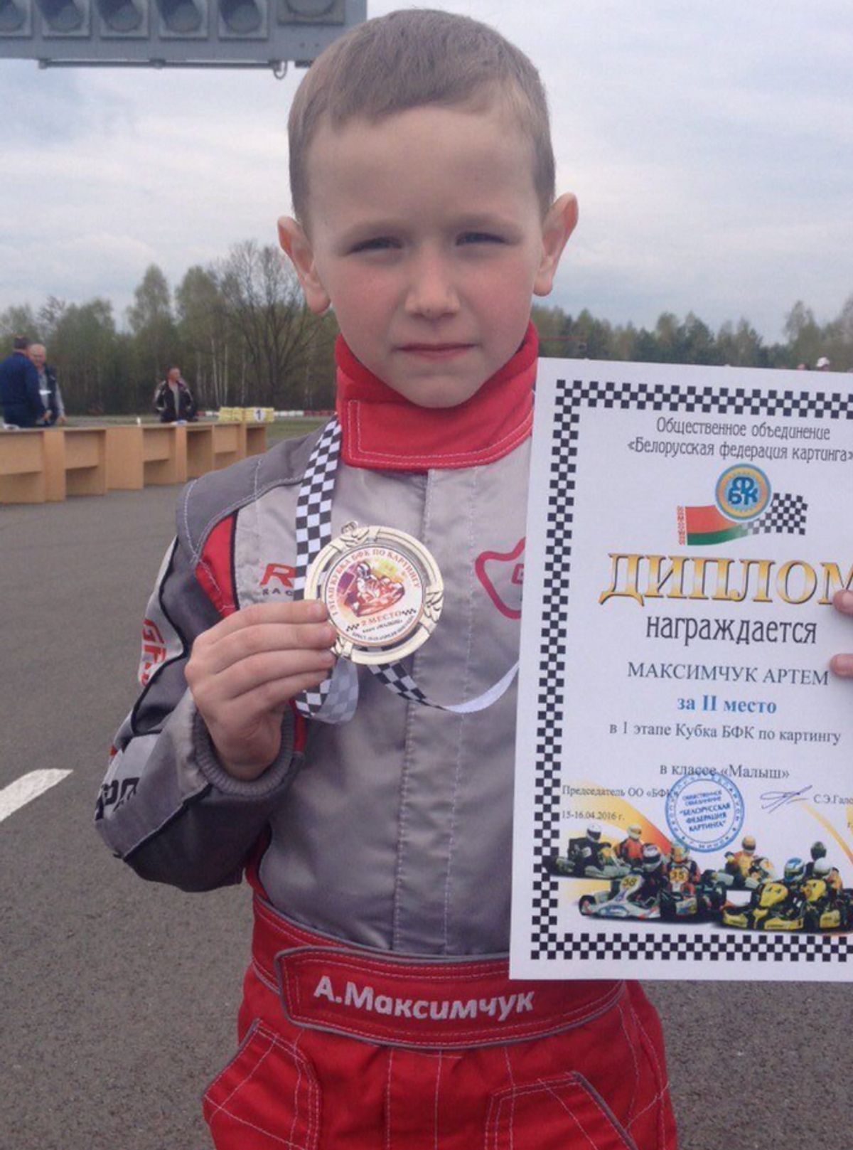 В ней Артем занимался несколько лет, начали приходить первые результаты. Азы управления картом юному пилоту преподавал чемпион Беларуси по трековым гонкам Андрей Остапенко, а затем юниор попал к тренеру Константину Андреюку – и увлечение вышло на новый уровень.Постепенно к тренировкам Артема стал подключаться и Сергей Лапицкий (экс-чемпион Беларуси по зимнему треку и картингу, ныне директор СДЮСТШ по автомотоспорту. – Прим. ABW), который также давал свои советы по управлению картом. Так появился вариант с выступлением в республиканских гонках в классе «Малыш», где гоняются на картах с 50-кубовыми моторами.«Артему та техника уже больше понравилась – конечно, ведь это настоящая гоночная машина, не прокатный карт! – смеется папа пилота. – На первую гонку мы отправились в Брест фактически без тренировок и тогда первый раз сразились с Даником Чернегой (в этом году он стал чемпионом Беларуси в самом быстром классе KZ2.). В той гонке Тема приехал вторым, борьба шла до самого последнего круга и поворота».
